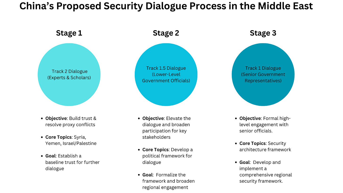 The first phase would bring together experts and scholars from Iran and Saudi Arabia in China for a track 2 exchange, aimed at building mutual trust and developing a shared framework for Gulf security. These discussions would focus on resolving proxy conflicts in Yemen and Syria, which are central to the Saudi-Iran rivalry. By addressing these conflicts early, the aim is to cultivate basic trust among the parties, setting the stage for further dialogue. This first phase would also allow Gulf countries to air their concerns and set conditions for advancing the process to higher levels of engagement.